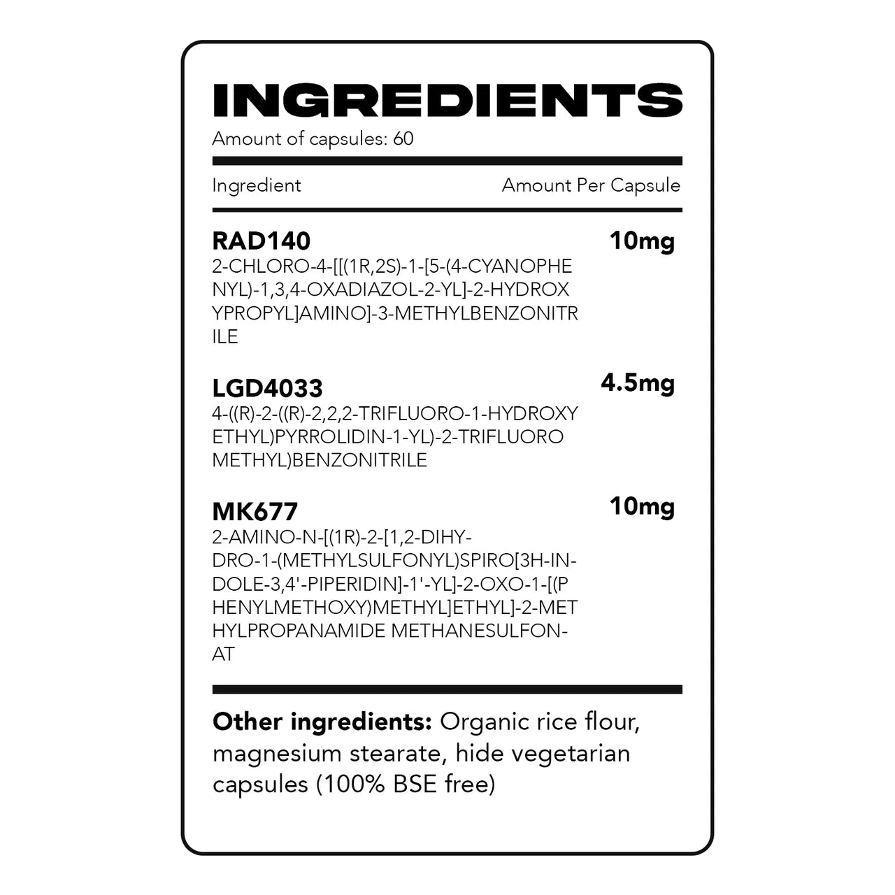 A powerful combination of LGD-4033, MK-677, and RAD-140, designed to maximize lean muscle growth, strength, recovery, and overall performance.